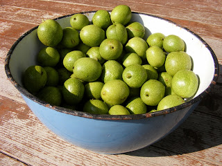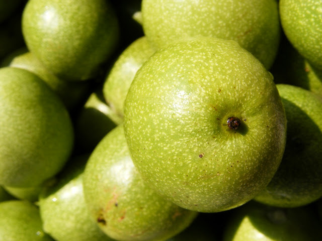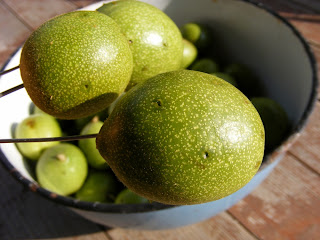 Így hát, családi vállalkozás keretében útjára indítottuk, a mi zölddió befőttünk készítését: Anyósom adta a receptet, a Férjem és Fiam szedtek még diót ( ugye így létra sem kellett... ), megmosták és hústűvel átszurkálták. Rám pedig a többi munka vár.Most az első fázisnál tart a dolog, mert sokáig nincs sok teendő, mint kiáztatni.Azért osztom már is meg, mert most van itt az ideje a zölddió szüretnek,hisz addig jó még zöld ( belül zöld, fiatal, azaz zöldfülű :D nem kezd el csontosodni.Így aki szeretne eltenni, csinálhatjuk együtt....