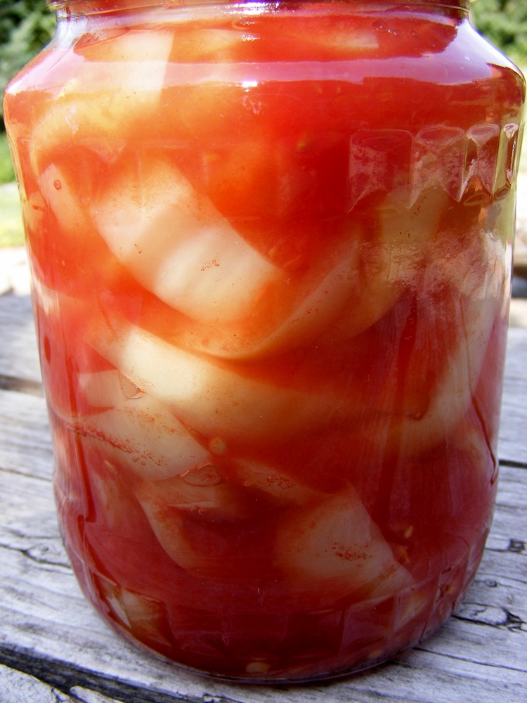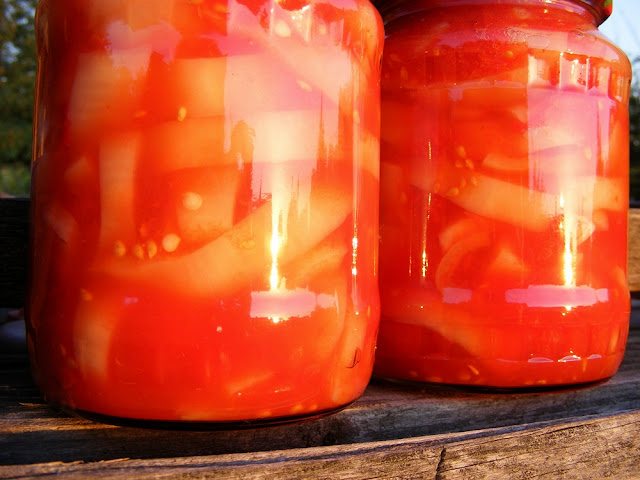 Vannak akik olyan szerencsések, hogy ettek már belőle télen, ahogy én készítettem el, vagy saját maguk elkészítve, mert megajándékoztam egy üveggel.Tőlük mindenképpen jogos a kérdés:- Hogy csinálod, mitől roppanós a paprika, miért nem főt szét?Akik nem ismernek annyira, azok pedig azt kérdezik:- Mit teszel bele? és én fülig érő szájjal válaszolom:- Hát paprikát és paradicsomot.- Jó, jó de milyen tartósítószert? és én örömmel mondom ki végre, amit már az elején szerettem volna szívem szerint, hisz ez a legfontosabb:- Semmit, nincs benne:))))Persze jön az újabb kérdés:- Akkor mitől áll el?- Attól, hogy szívvel-lélekkel csinálom, már akkor is amikor elültetem a magot a kertemben, attól, hogy egész nyáron jelen vagyok a paradicsombokorjaimnak, paprikáimnak, attól, hogy természetesen nem használok vegyszert a kertemben ( bár ennek nem is szabadna ma már kérdésnek lenni), attól hogy a Nap érlelte és akkor szedtem le, amikor eljött az ideje a befőzésnek, attól, hogy ..... és végül attól, hogy tisztán teszem el (ebbe beletartozik az üveg tisztasága és a zöldség tisztasága), légmentesen lezárom és hőkezelem.És még valami: testileg, lelkileg, szellemileg rákészülök, ráhangolódok, öröm van bennem és végül (bár ezt már az elején szoktam meggyújtani) ég egy mécses (betartva a biztonsági szabályokat).